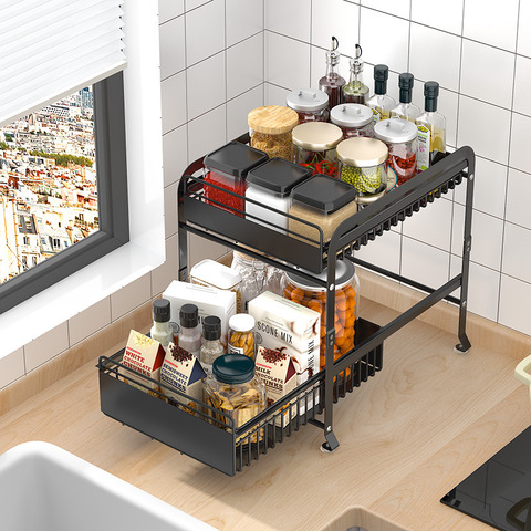 Armario de cocina inferior Push-Pull telescópico, estante de acabado multicapa, estante de almacenamiento de especias para fregadero, estante de almacenamiento